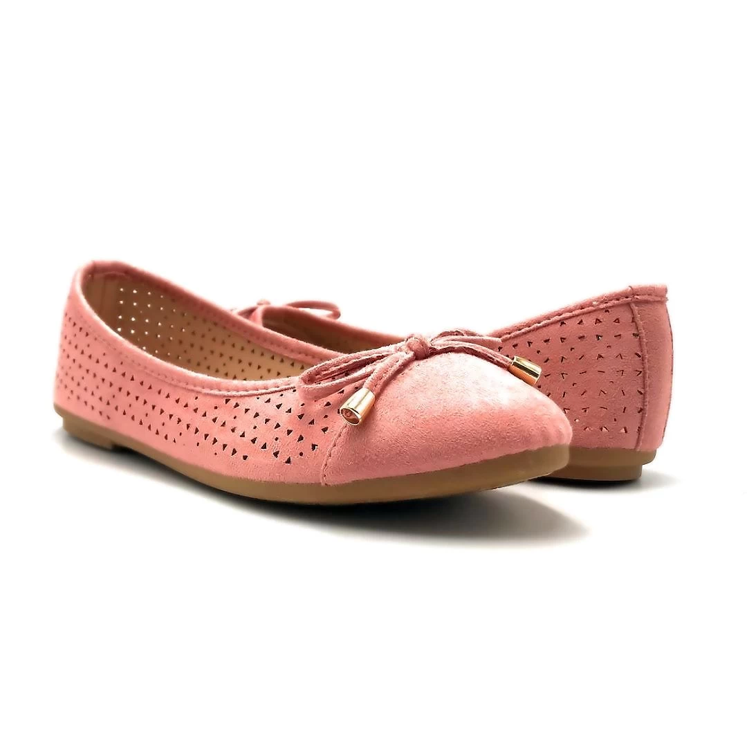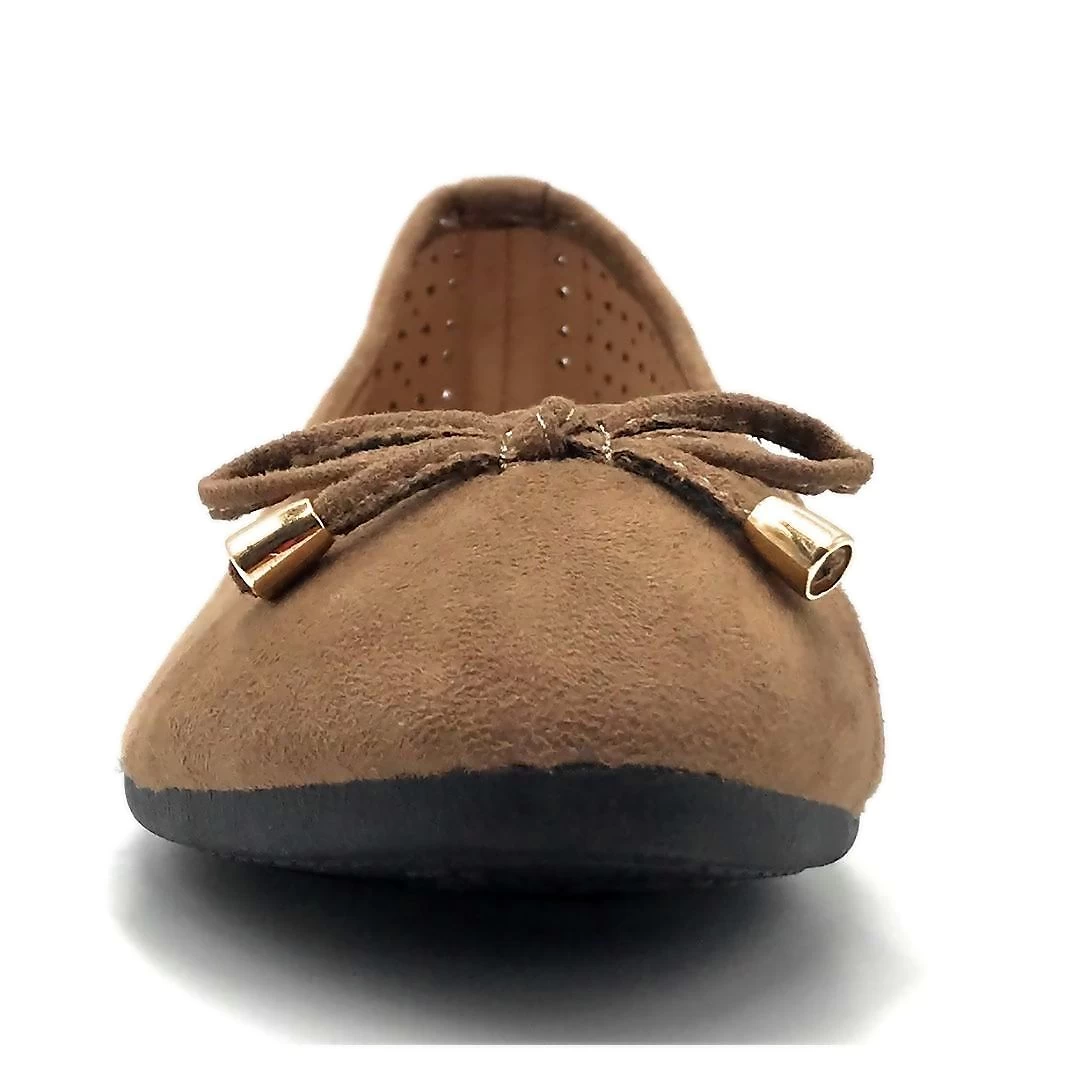 - This ballets have comfortable arch support with padded insole, Closed toe with non slip rubber outsole, Classic ribbon bow accent with golden aglets and Ventilation triangle holes at side of ballets for breathable, odor free feet.