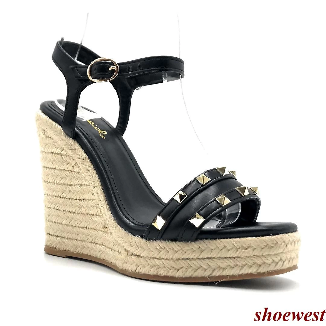 Qupid Round Toe Pyramid Stud Strap Wedge Sandal