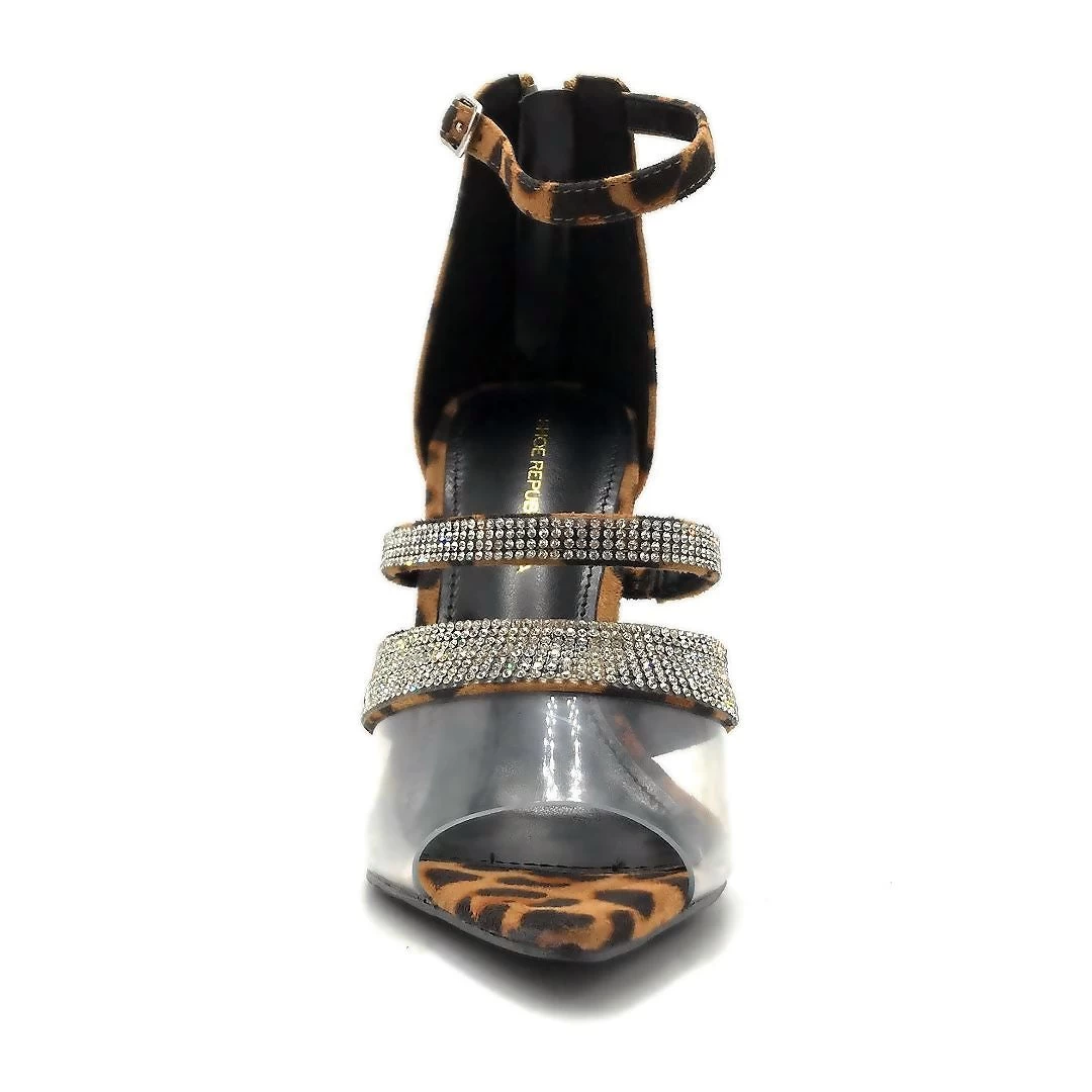 - Features a pointed peep toe paired with a covered back. A Lucite upper with rhinestone strap accents and an ankle strap closure. Single sole styling and a stiletto heel.